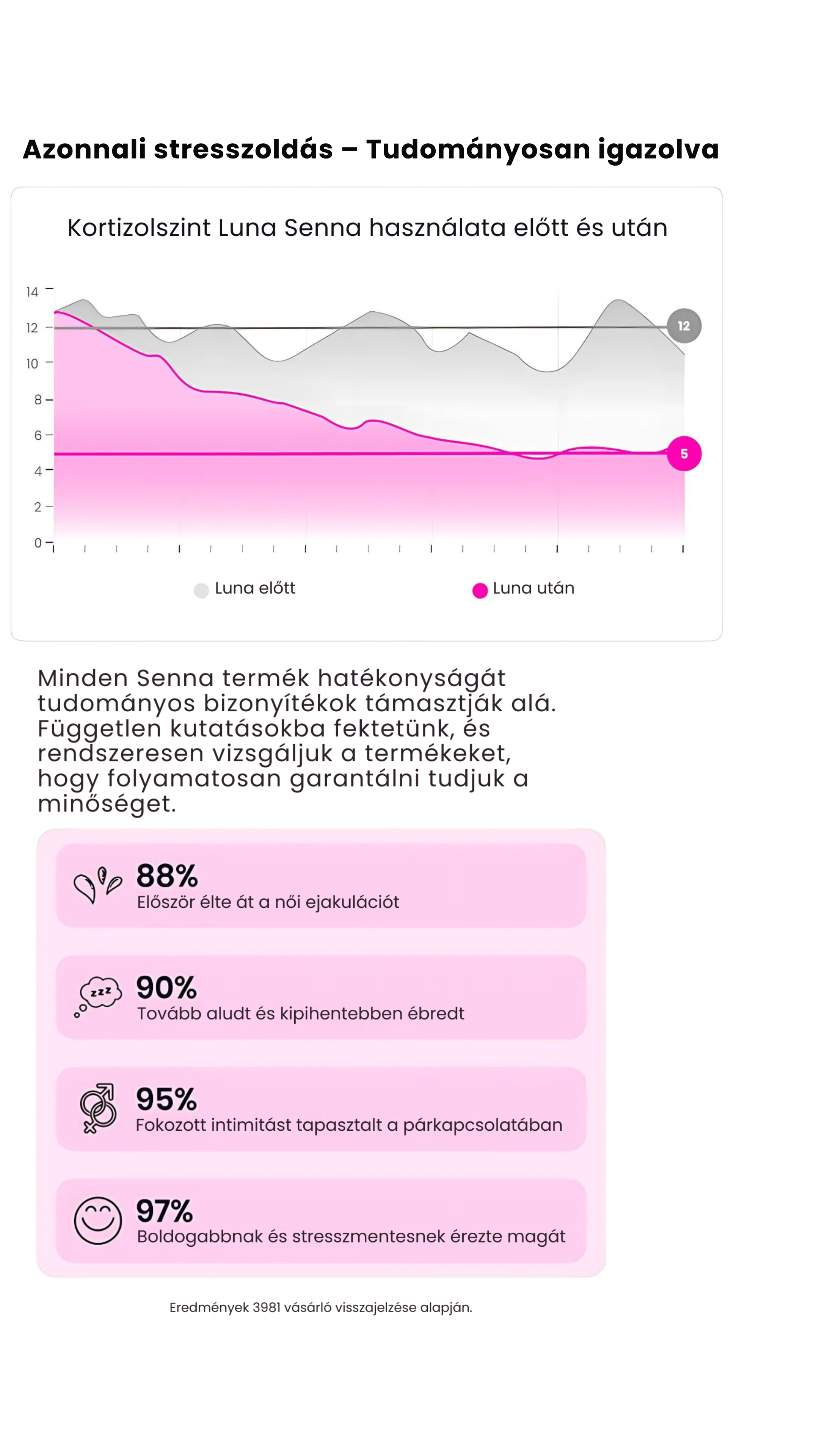 A tested stresszre adott reakciója nap mint nap hatással van a mentális és fizikai jóllétedre. Az intimitás nem luxus – hanem alap. A Luna Senna nemcsak egy self-care eszköz, hanem egy kulcs az újrakapcsolódáshoz: szenvedély, öröm és vágy újra feléledhet a hálószobában – benned.